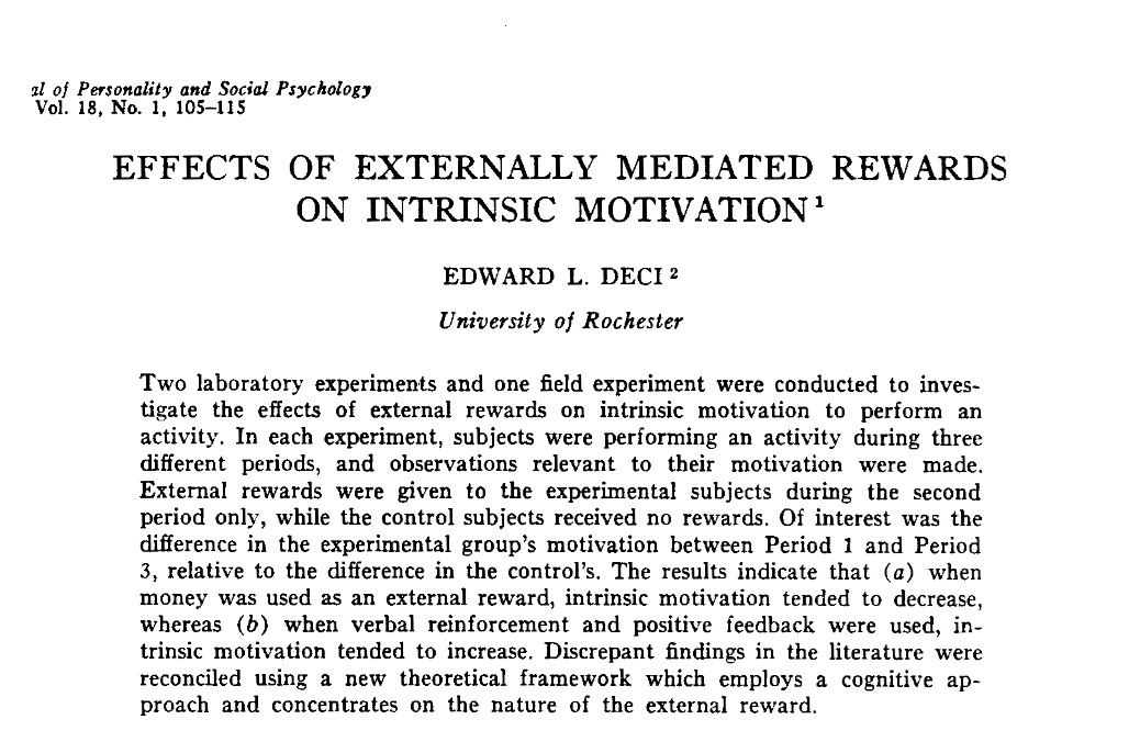 Met dit vroege experimentele onderzoek legde Deci het fundament voor een enorme hoeveelheid onderzoeken naar intrinsieke motivatie, extrinsieke motivatie, financiële en niet-financiële beloningen. Hij borduurde voort op eerdere onderzoekers, zoals deCharms en Festinger, en heel veel onderzoekers borduurden weer voort op dit vroege werk van Edward Deci. Nu is er een schat aan inzichten in de kwaliteit van motivatie en menselijk floreren.